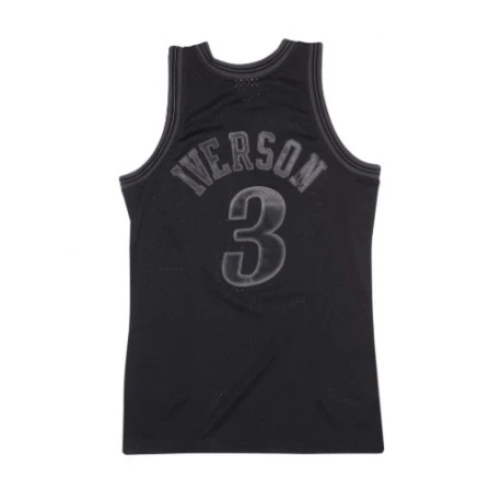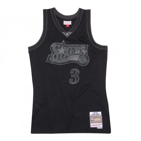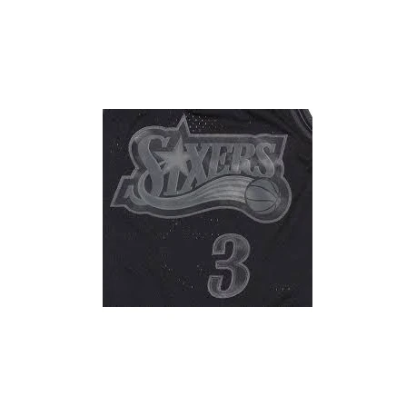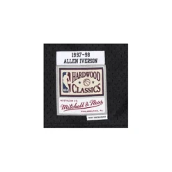 Le nom et le numĂ©ro de Allen Iverson sont en sergĂ© sĂ©rigraphiĂ©s afin d’imiter avec prĂ©cision le look authentique du maillot de l’Ă©quipe NBA des Philadelphia Sixers en 1997-98.
