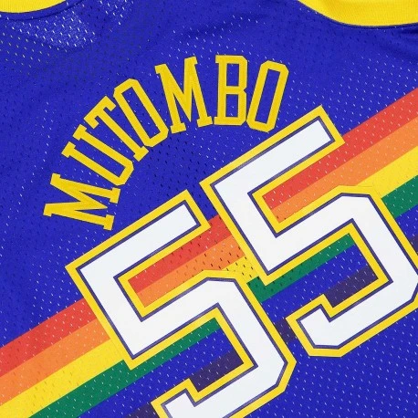 Le nom et le numĂ©ro de DIKEMBE MUTOMBO sont en sergĂ© sĂ©rigraphiĂ©s afin d’imiter avec prĂ©cision le look authentique du maillot de l’Ă©quipe NBA des Denver Nuggets.