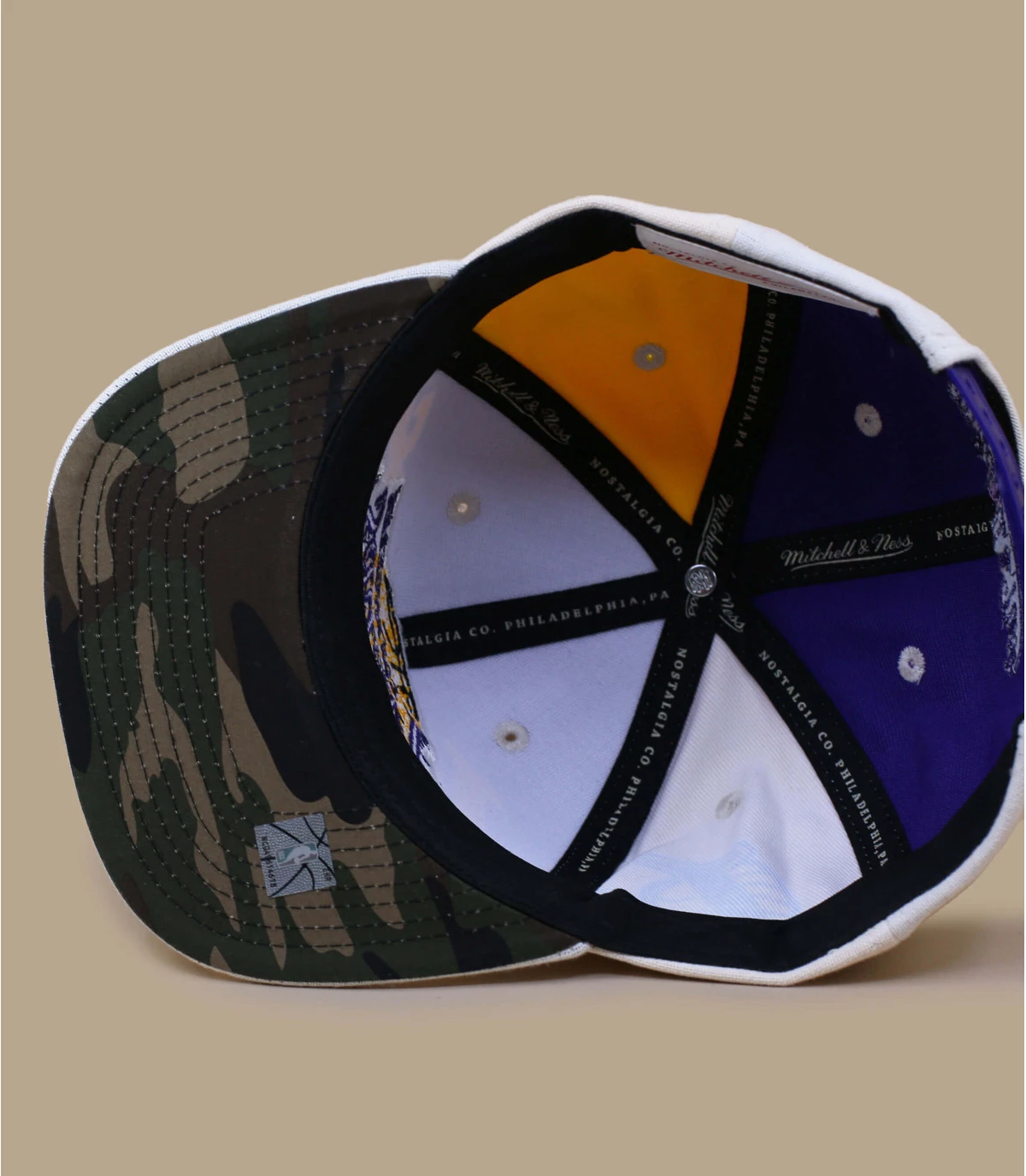 Soyez inoubliable avec cette casquette snapback beige portant le logo de l’équipe des Lakers de Los Angeles, l’une des équipes les plus titrées de la NBA ! Vous pouvez découper le tissu à l’avant pour lui donner un côté destroy.