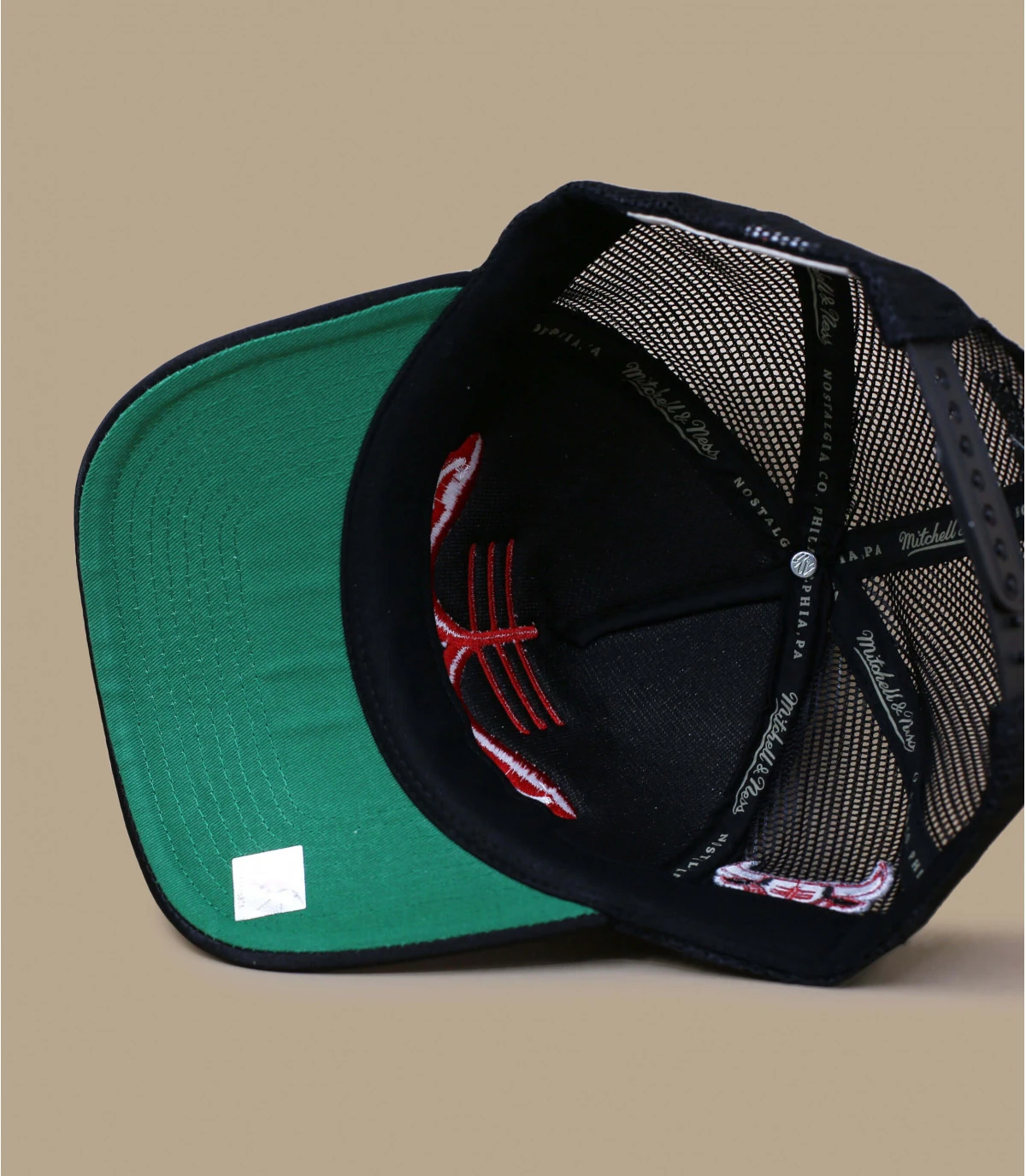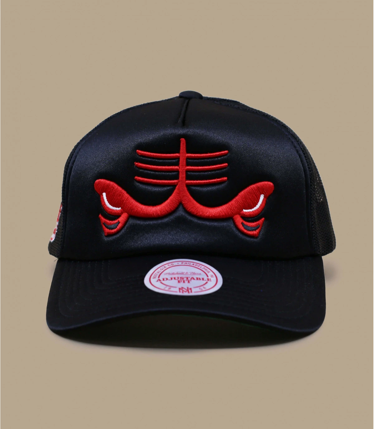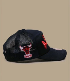 Le logo de l’équipe des Chicago Bulls a été légèrement remixé sur cette casquette trucker noire et grise pour ne montrer que les yeux froncés de la mascotte de taureau. Les Bulls ont remporté 6 championnats NBA.