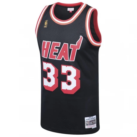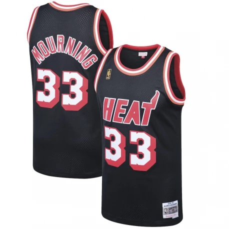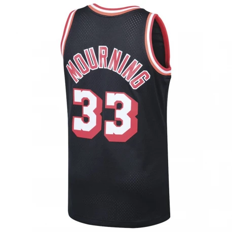Le nom et le numĂ©ro de Alonzo Mourning sont en sergĂ© sĂ©rigraphiĂ©s afin d’imiter avec prĂ©cision le look authentique du maillot de l’Ă©quipe NBA des Miami Heat.