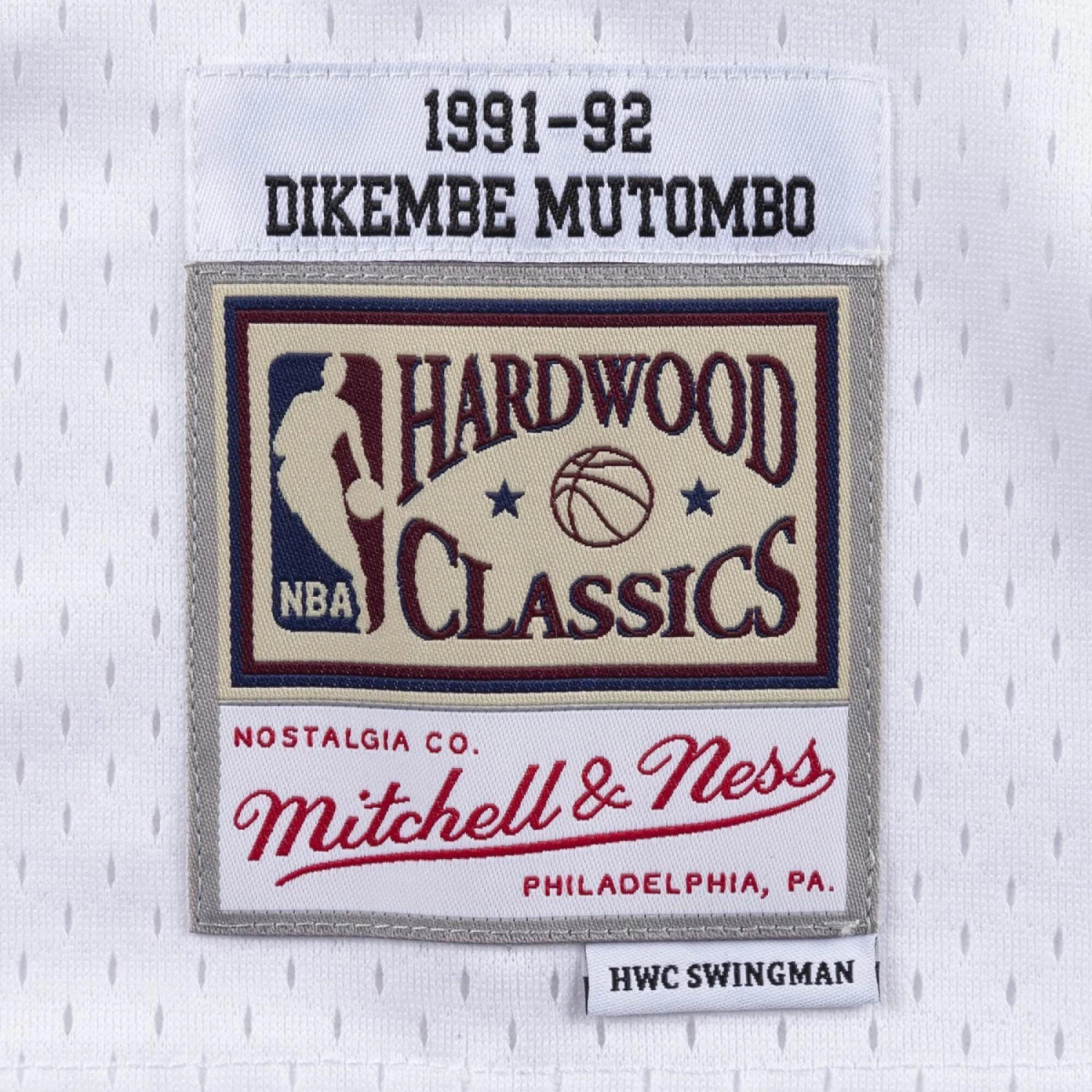 - Mitchell & Ness HWC Swingman a tissĂ© un jocktag et une Ă©tiquette avec le nom et l’annĂ©e du joueur en bas Ă gauche.