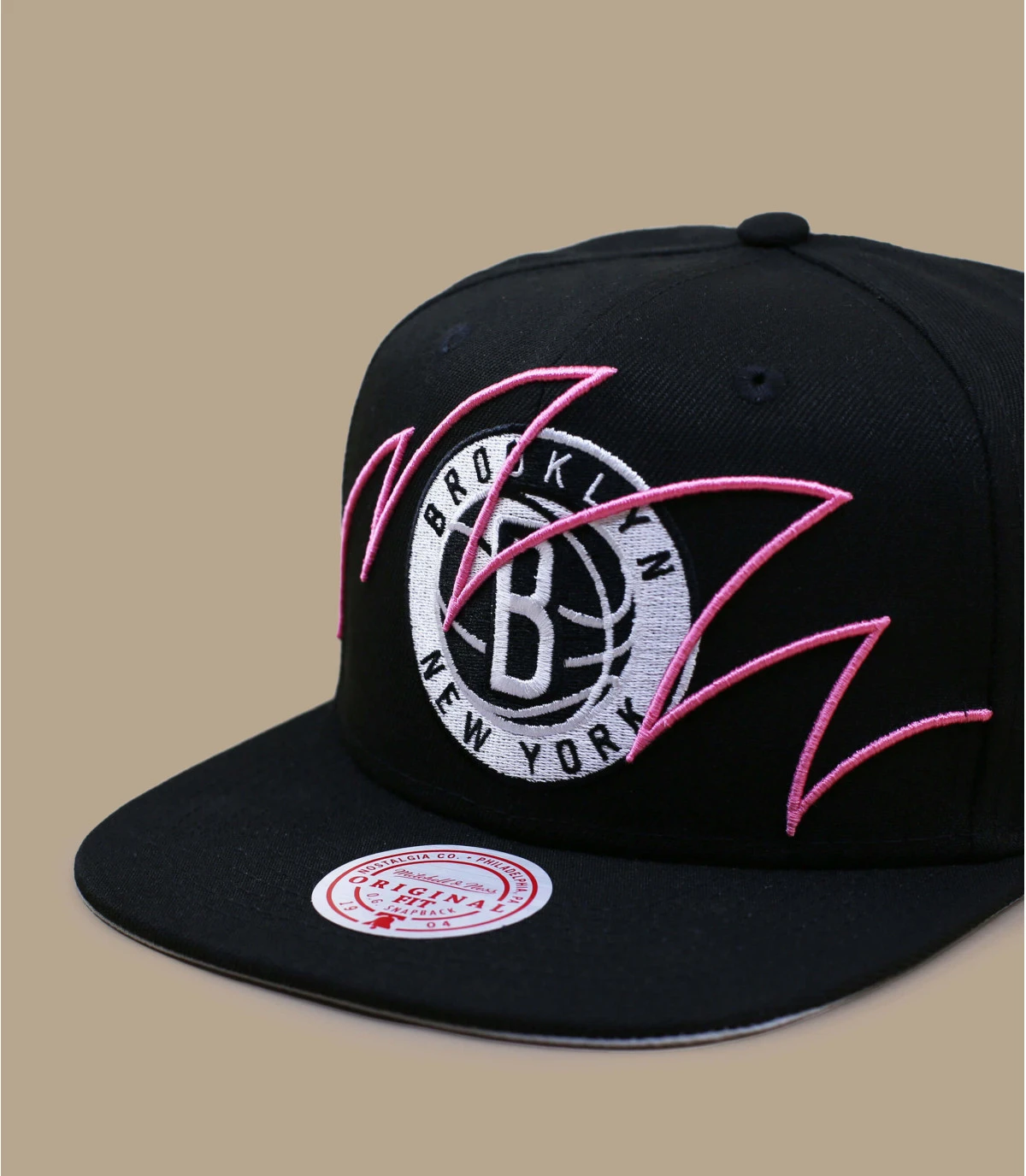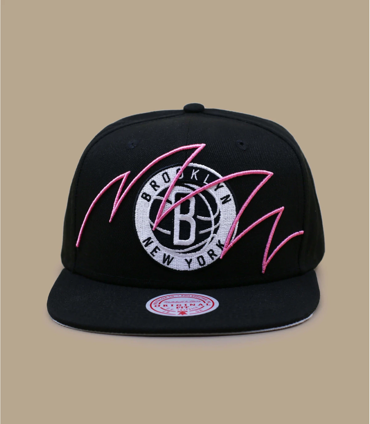Vous allez être mordus par le style de cette casquette snapback noire portant le logo noir et blanc de l’équipe NBA des Brooklyn Nets. Il est décoré d’un motif rose de vagues représentant une morsure de requin.